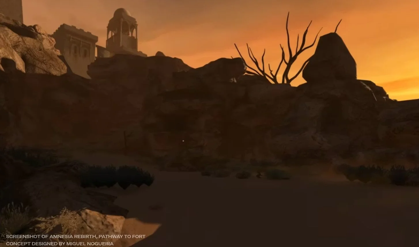 In this old screenshot from Amnesia: Rebirth, a game I worked on as Principal Concept Artist, we see the Fort in the distance. We haven't had much chance to glimpse something like it so far in our travels through the desert, and we still don't fully see it. But we know, as players, that's where we want and need to go. This is the sweet spot: designing an experience the player wants to have and one they need to have to advance in the game. By showing just enough of the Fort's silhouette, you invite the player to keep moving forward, reaching the Fort and starting a new chapter.