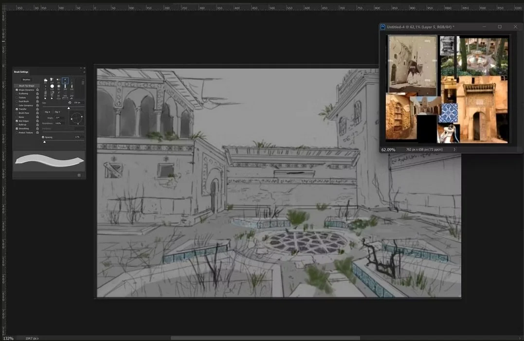 Line drawings like these take me about 30 minutes to an hour. They bring just enough detail to draw over the level block-out, and I use photo references to fill the gaps in any ambiguous linework. People respond to different levels of detail. Some studio decision-makers respond well to a polished image, while others, like Art Directors, find it easier to read a less polished sketch. Bringing in these photo references helps bridge that gap as quickly and efficiently as possible.