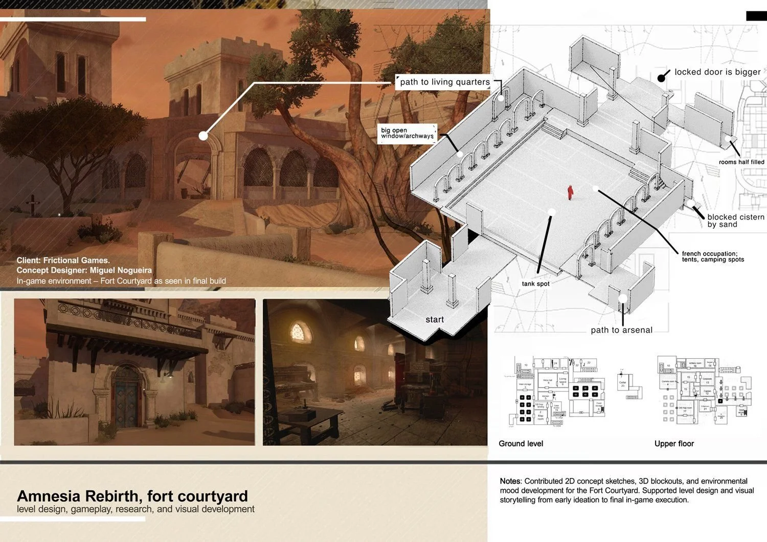 The most important part is the level design. To make a place fun to play, I first build the levels as 3D cubes. I overlap empty spaces, doorways, windows, and fences and show parts of the level from far away without revealing everything. This makes players curious and they'll want to keep exploring. I helped design about 3 out of every 10 parts of the levels in Amnesia: Rebirth and also made 80% of the art, including props, lighting tests, and interactive objects, as well as some characters.