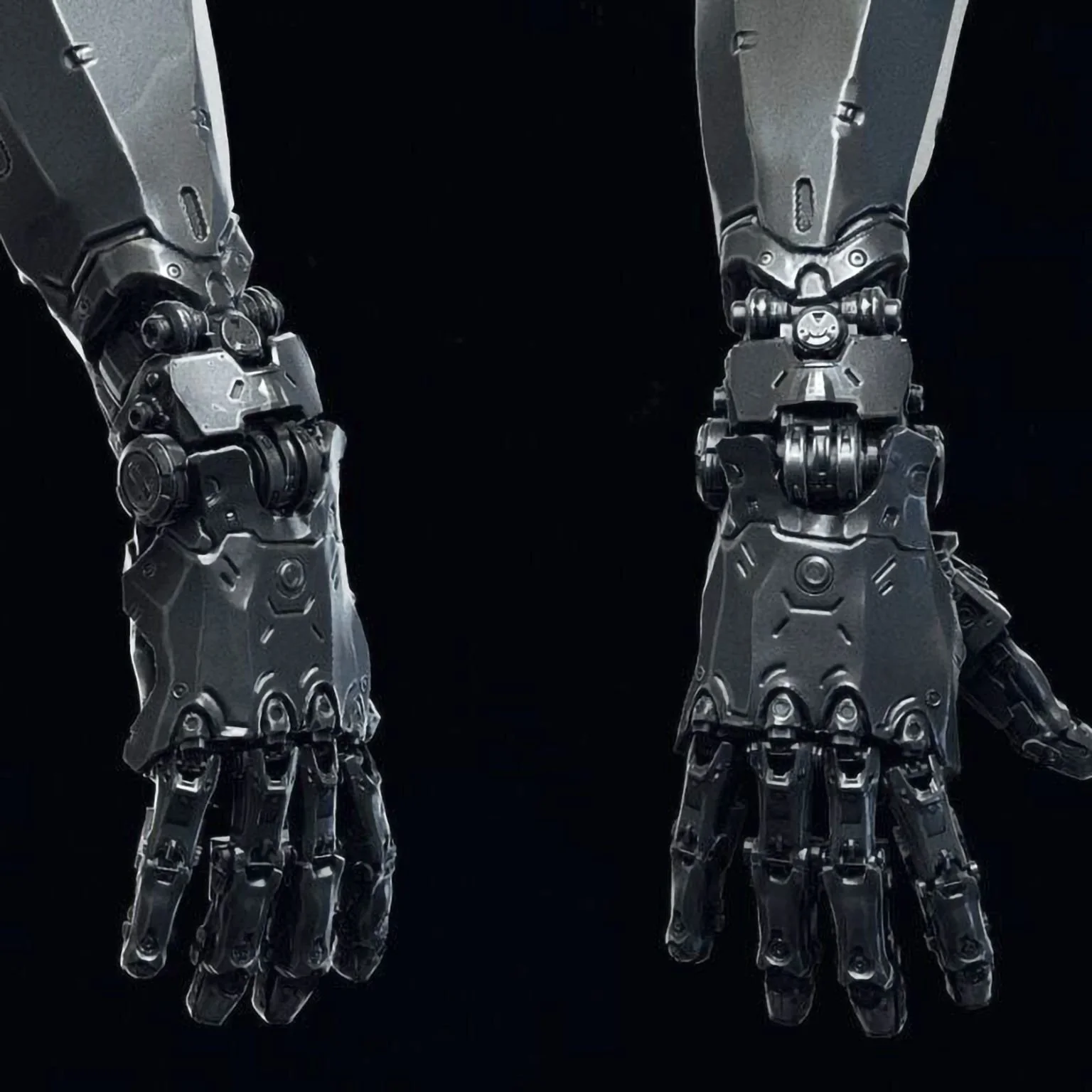 Arms like these start from a free base mesh, a normal human arm, which I then sculpt on top by re-skinning it as hard-surface concept art, and converting all the human joints, fingers, and bending parts into screws, pistons, and ball joints; a process often requested in my custom 3D character design services.
